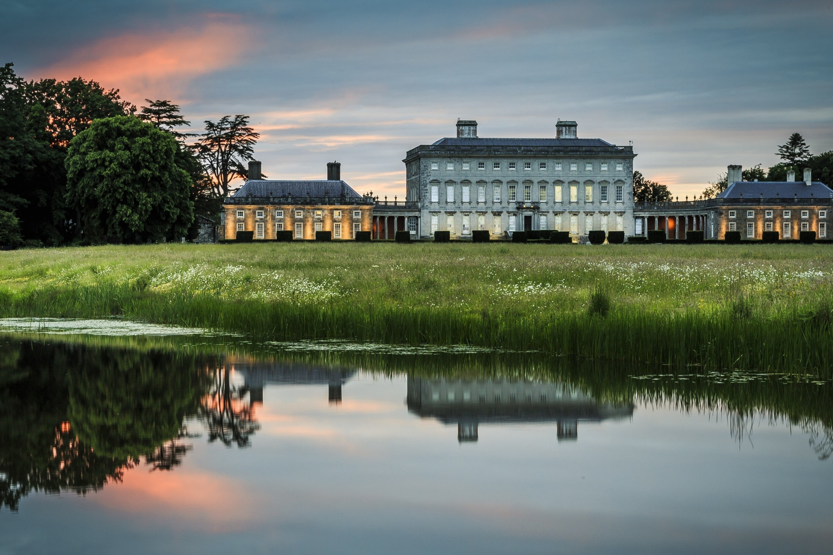 Buildings Mansion Lake Grass Reflection Sky Sunset Image information: